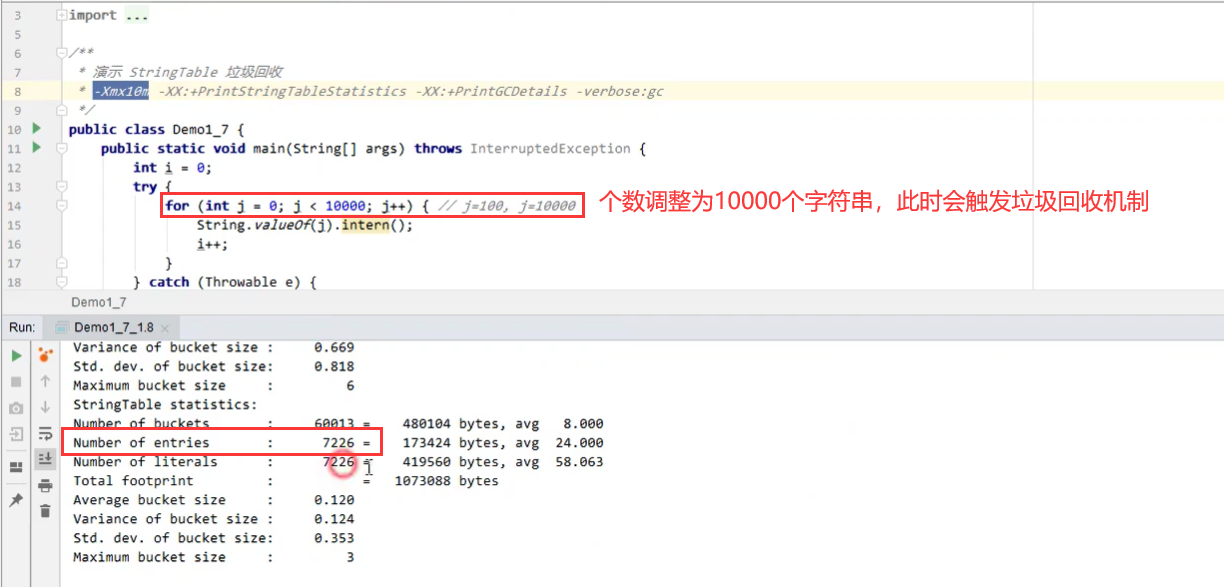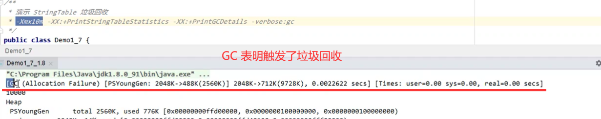 虚拟机配置: -Xmx10m -XX:+PrintStringTableStatisttics -XX:+PrintGCDetails -verbose:gc
