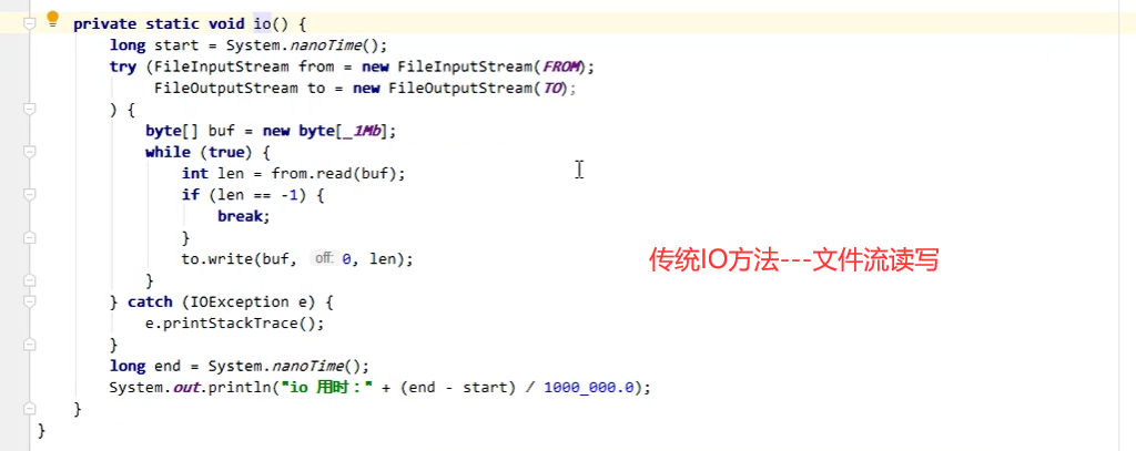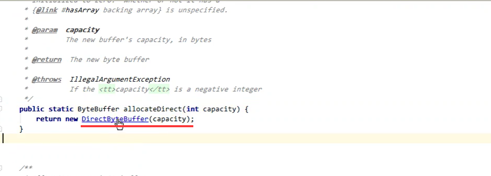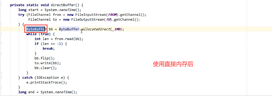 使用 ByteBuffer 后则会开辟一块Java和系统都能够共享的区域 direct memory(直接内存),这样一来就不用重复复制效率便提高了。