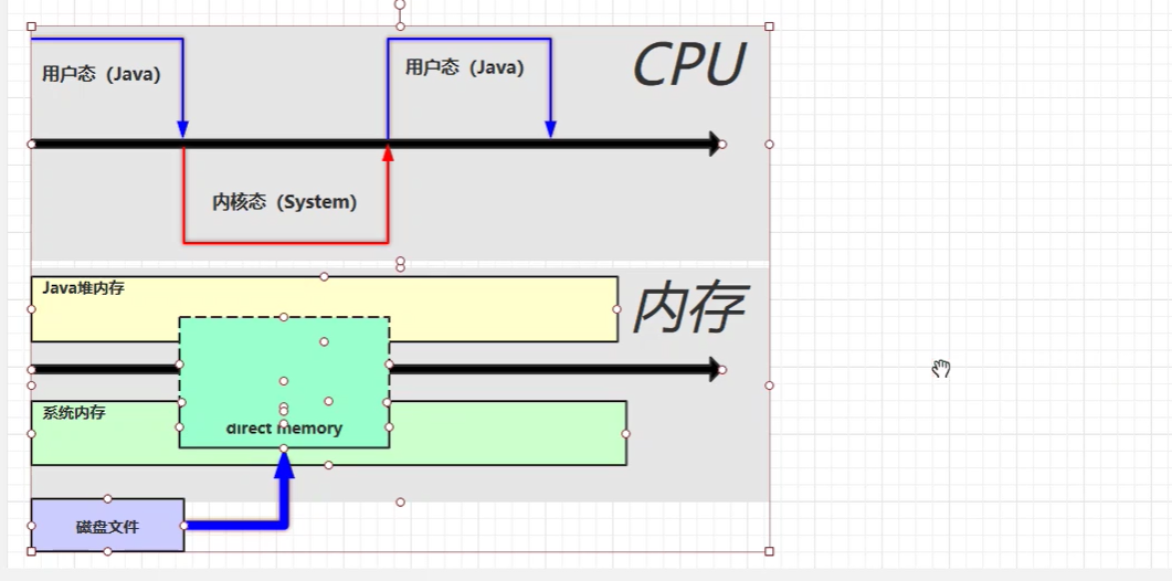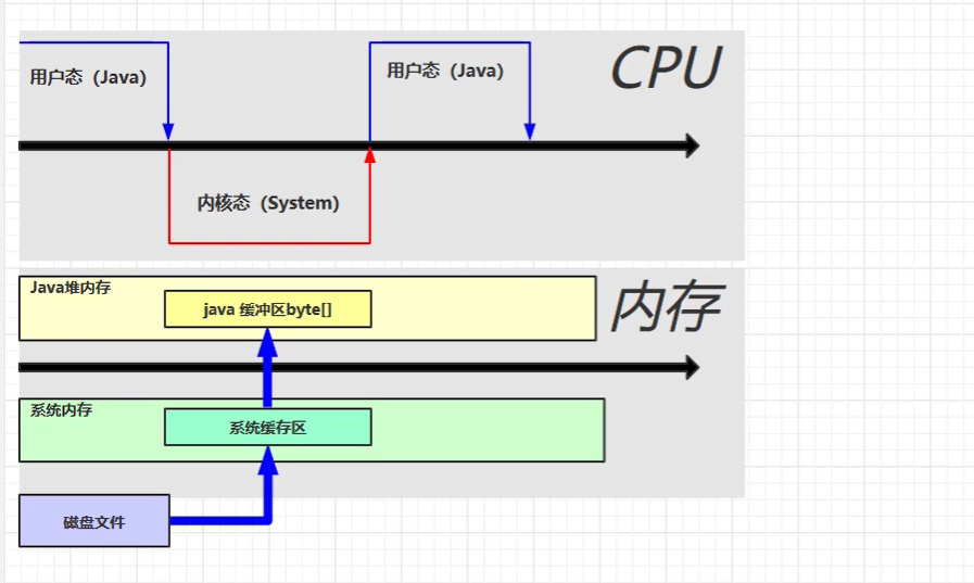 首先Java代码本身不具有读写文件的能力,它需要调用操作系统的方法来进行文件读写。CPU 方面会由用户态切换为内核态;内存方面会在系统内存划分一块系统缓存区,将磁盘文件读取到系统缓冲区然后再将系统缓冲区中的文件数据读取到Java 缓冲区(堆内存分配的)。