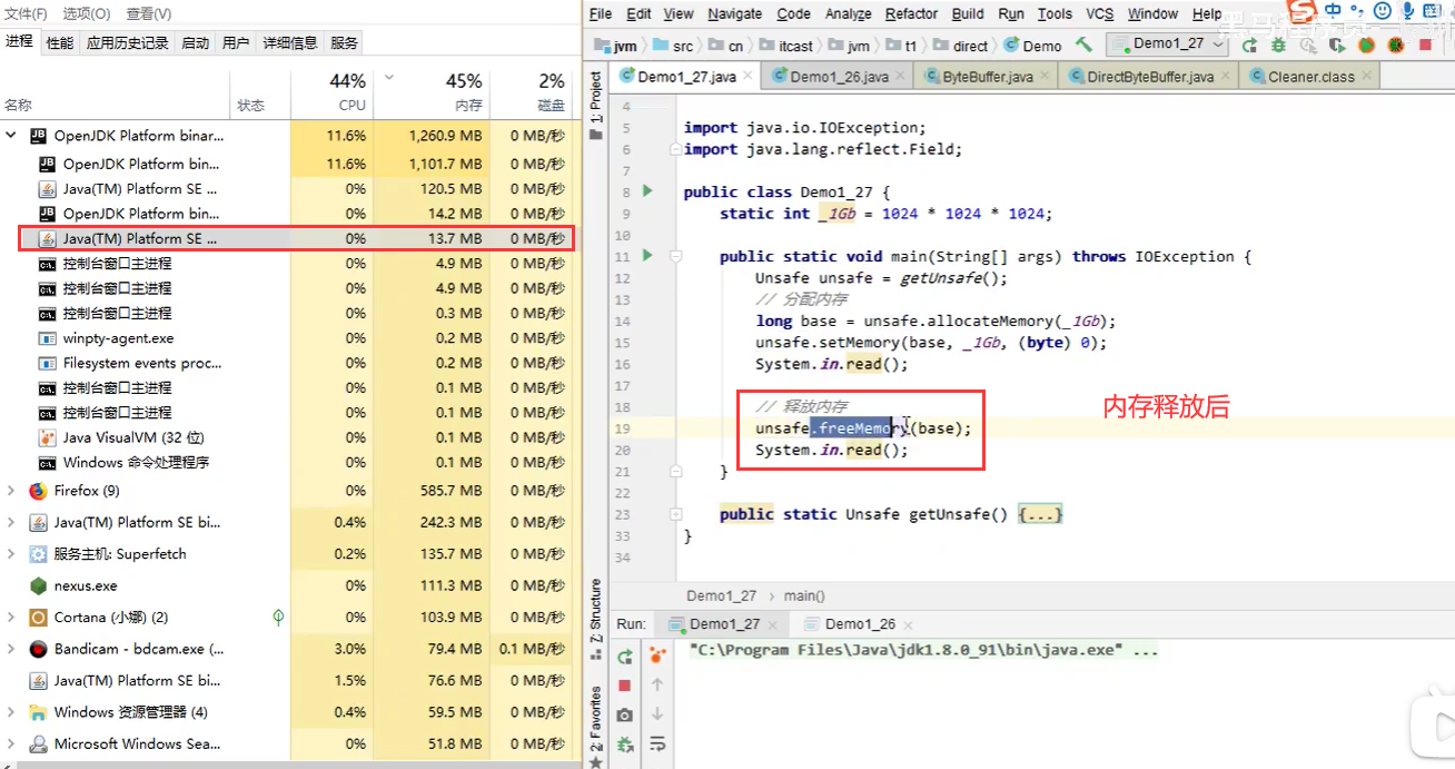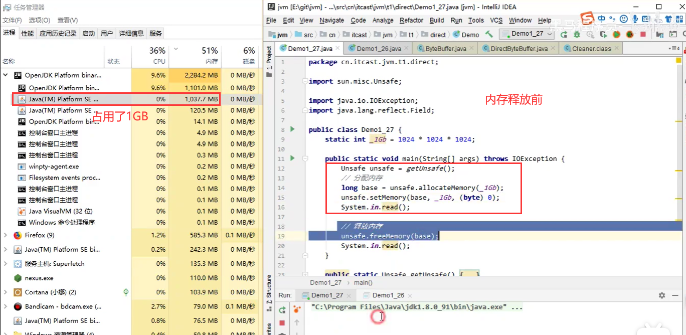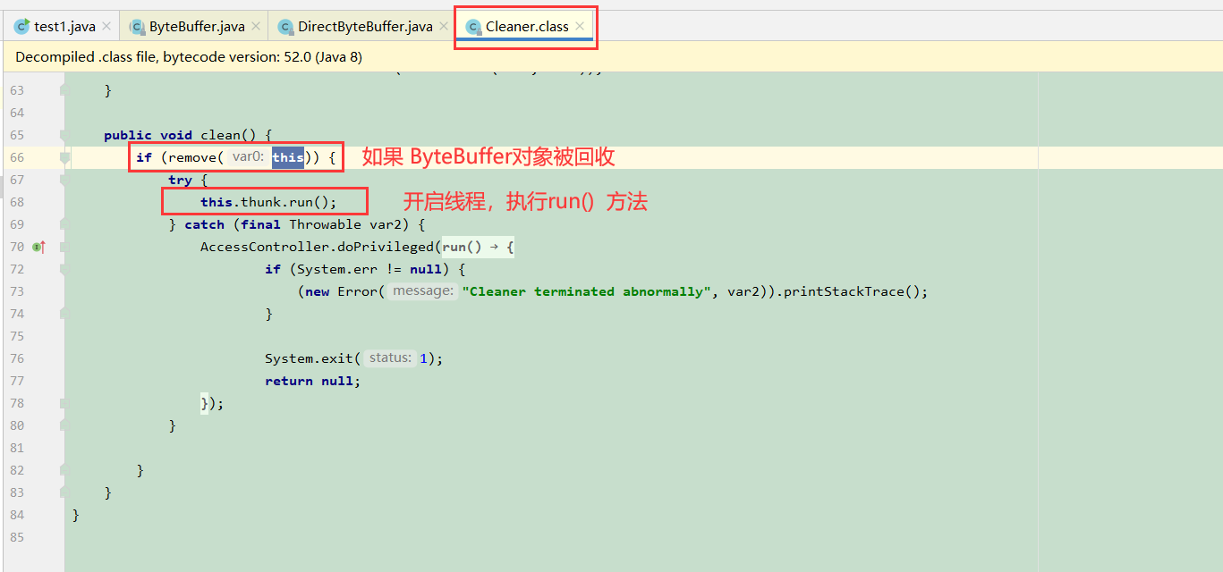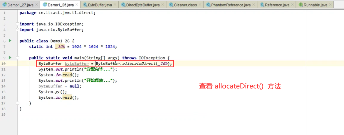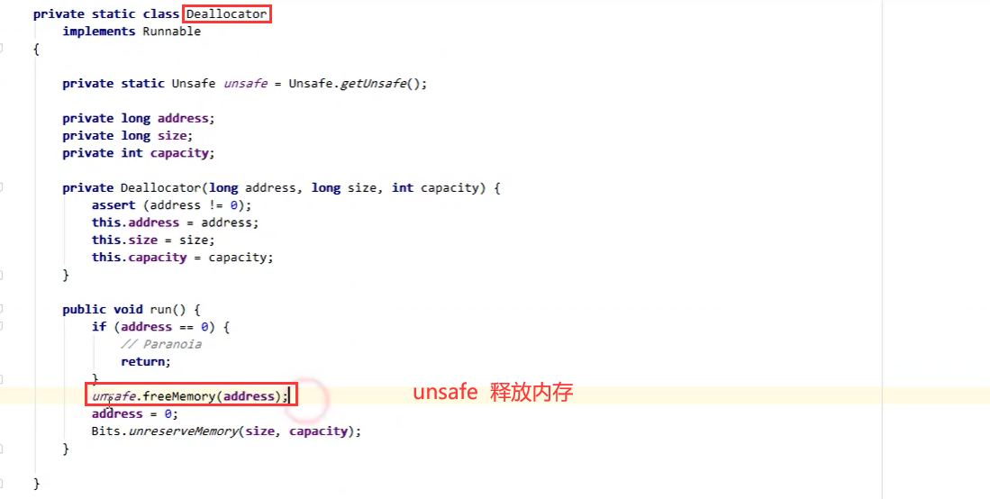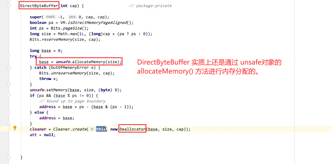 Unsafe对象完成直接内存的分配(allocateMemory)回收(freeMemory),并且回收需要主动调用freeMemory方法。 ByteBuffer的实现类内部,使用了Cleaner(虚引用) 来监测ByteBuffer对象,一旦ByteBuffer对象被垃圾回收,那么就会由ReferenceHandler线程通过Cleaner的clean 方法调用freeMemory来释放直接内存。