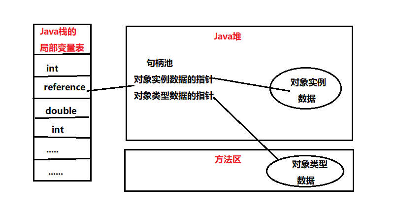 句柄访问:Java堆中会额外划分出一块内存充当句柄池,reference 中存储的是对象的句柄地址。而句柄中包含了对象的对象实例数据和对象类型数据的地址;