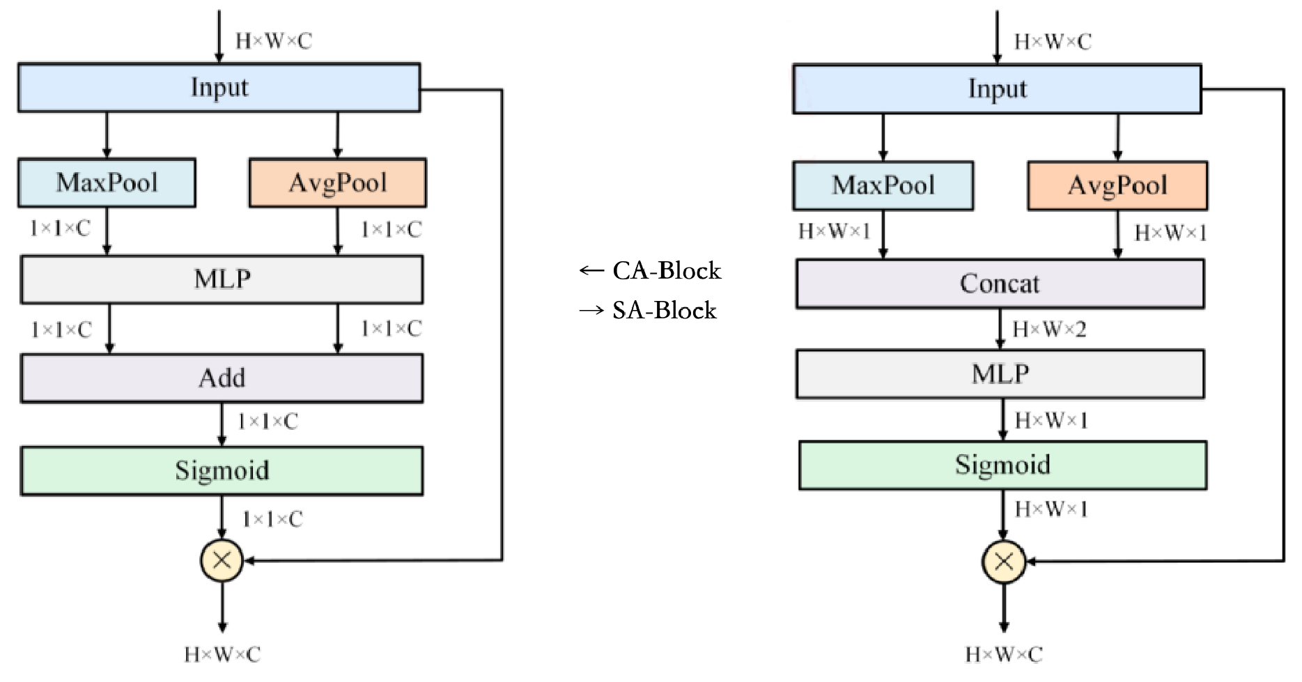特征图依次通过 CA-Block 和 SA-Block 进行通道加权和空间加权。在 CA 阶段,注意力形状为 \(\mathbf{M}_C \in \mathbb{R}^{1 \times 1 \times C}\),分别对每个通道调整权重;在 SA 阶段,注意力形状为 \(\mathbf{M}_S \in \mathbb{R}^{H \times W \times 1}\),分别对每个像素调整权重。通道注意力与空间注意力正交地学习。