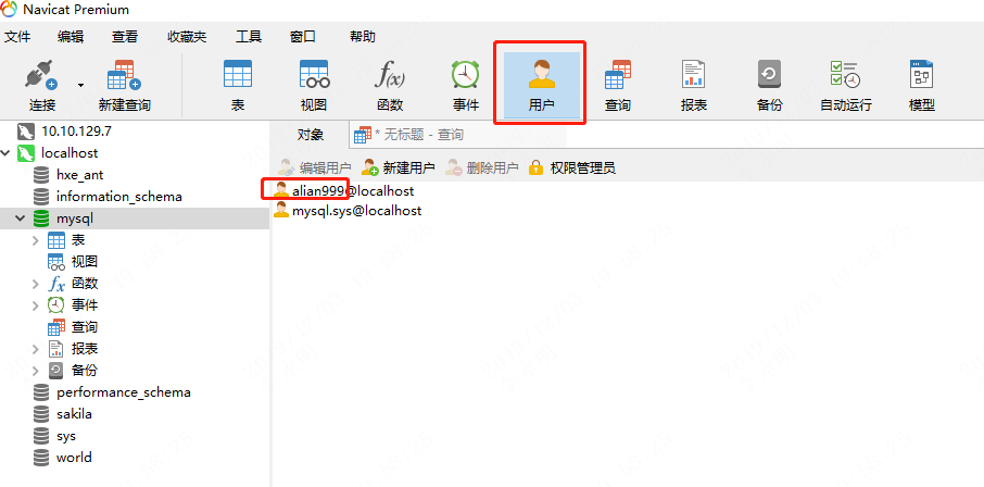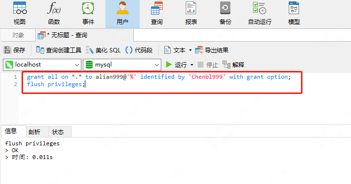 grant all on *.* to admin@'%' identified by '123456' with grant option;