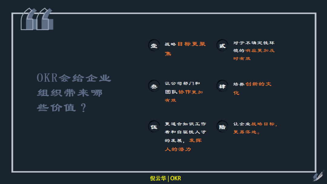 从OKR的本身的操作来说,它不是一个新生的事物或者一个非常复杂的事物。但是OKR背后所蕴含的管理的思想或者方法对于我们去应对数字时代的变化和革新是非常有作用的。
