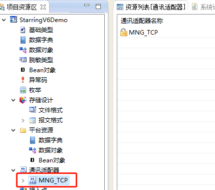 4. JFBuilder-->资源树的starringv6demo环境->通讯适配器->MNG_TCP->数据对象,