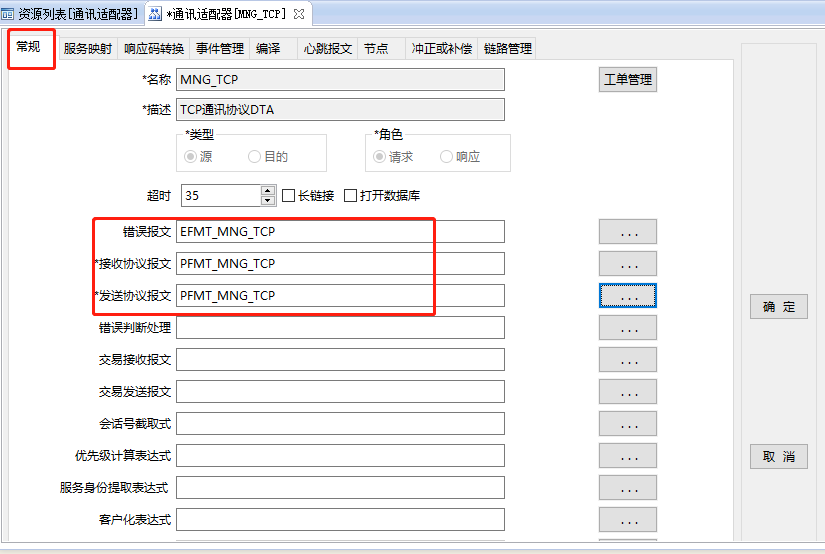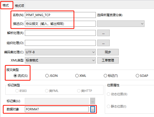 右击新增一个协议报文,名称:PFMT_MNG_TCP,描述:协议报文(输入、输出相同),报文类型:”流式”,数据对象: FORMAT。