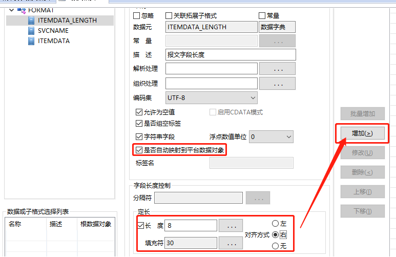 点击格式项,在数据集合中选择数据元ITEMDATA_LENGTH,勾选自动映射到平台数据对象,数据属性为定长,长度”8”,填充符在字符定义窗口中,ASCII码输入框输入0,十六进制框显示30(0x30为0的ASCII码值),对齐方式”右”,点击增加按钮,增加该数据元到格式项列表中。