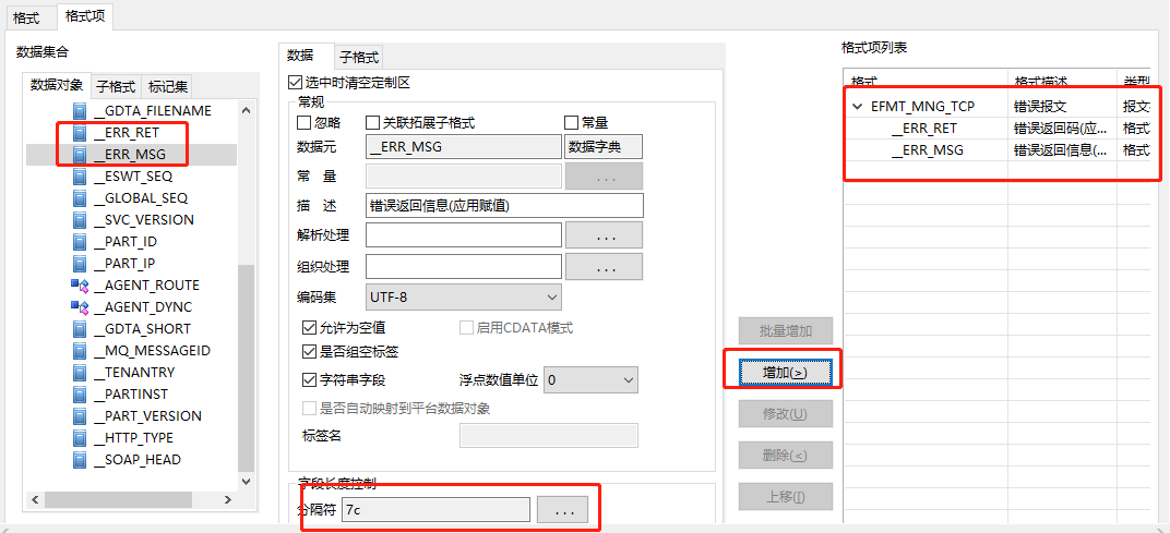 6. 资源树的starringv6DEMO环境->通讯适配器->MNG_TCP->报文格式,新增一个错误报文。名称:EFMT_MNG_TCP,描述:错误报文,数据对象:平台资源柜员渠道的错误返回下:__GDTA_FORMAT。格式项为__ERR_RET、__ERR_MSG,使用分割符0x7c(|),即变长报文。