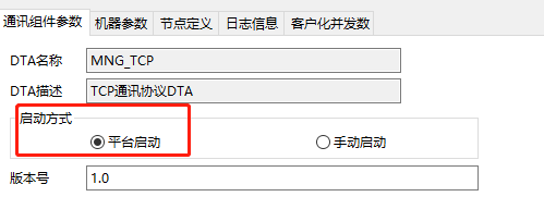 8. 切换到JFConfig,选择通讯适配器,修改MNG_TCP DTA。通讯组件参数TAB页,启动方式:平台启动。