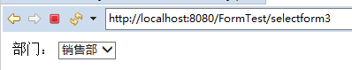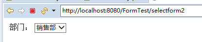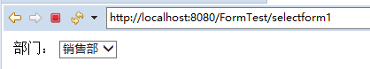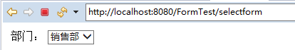 @RequestMapping(value="selectform1", method=RequestMethod.GET) public String slectForm1(Model model) { User user = new User(); user.setDeptId(2); model.addAttribute("user", user); Map<Integer,String> deptMap = new HashMap<Integer,String>(); deptMap.put(1, "开发部"); deptMap.put(2, "销售部"); deptMap.put(3, "人事部"); model.addAttribute("deptMap", deptMap); return "content/selectForm1.jsp"; }
