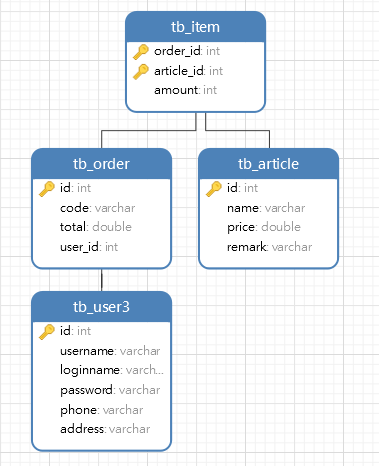 CREATE TABLE tb_user3( id int(11) PRIMARY KEY, username VARCHAR(18), loginname VARCHAR(18), password VARCHAR(18), phone VARCHAR(18), address VARCHAR(18) ) CREATE TABLE tb_article( id INT PRIMARY KEY, name VARCHAR(18), price DOUBLE, remark VARCHAR(18) ) CREATE TABLE tb_order( id INT PRIMARY KEY, code VARCHAR(18), total DOUBLE, user_id INT, FOREIGN KEY (user_id) REFERENCES tb_user3(id) ) CREATE TABLE tb_item( order_id INT, article_id INT, amount INT, PRIMARY KEY(order_id,article_id), FOREIGN KEY(order_id) REFERENCES tb_order(id), FOREIGN KEY(article_id) REFERENCES tb_article(id) )