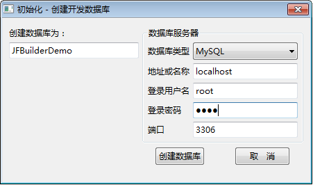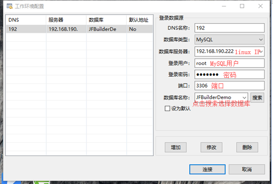 2.选择一个工作环境配置->连接;用户登录(登陆root/root创建其它用户或用户组:JFBuilder
