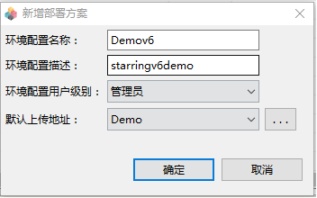 5.新建部署方案,配置环境名称为项目名称,描述为项目描述,选择默认上传地址