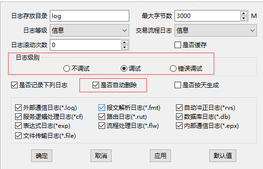 8. 系统管理->平台管理(starringv6demo环境)->运行系统参数配置-日志参数,双击“日志参数”,在右侧日志参数页面,日志级别选择调试,选择“是否自动删除”复选框(注意如果日志级别选择不调试,所有DTA/ALA的调试文件不会产生,只有发生错误时,产生Starring.log和estack.log两个错误日志文件。)