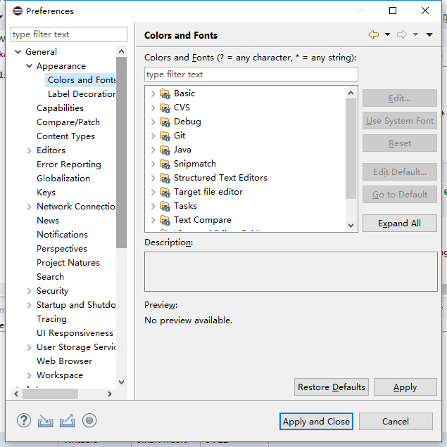 2.点击后在下拉菜单中找到Preferences选项,点击General--》Appearance--》Colors and Fonts--》Basic