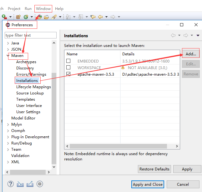 3.1 点击eclipse工具条Window--》Prferences,然后在左侧栏中找到Maven--》Installations,再点击Add添加maven
