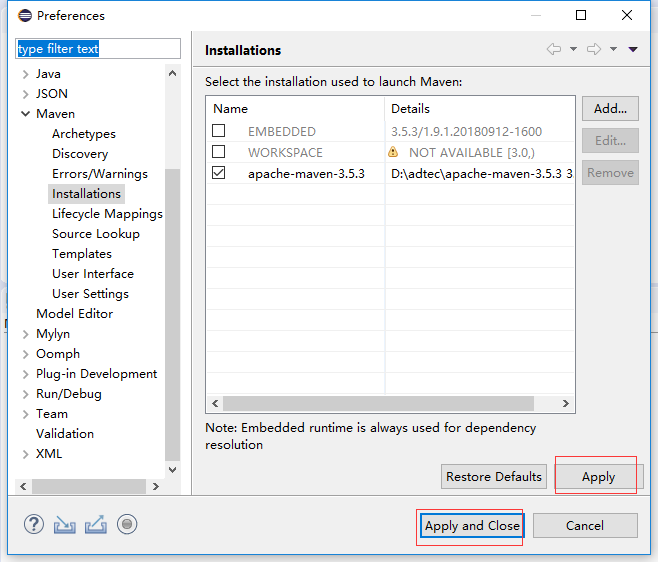 3.3 点击finish后出现以下界面,然后再选中刚才添加的maven,点击Apply或Apply And Close 按钮结束配置。maven已配置在eclipse中。