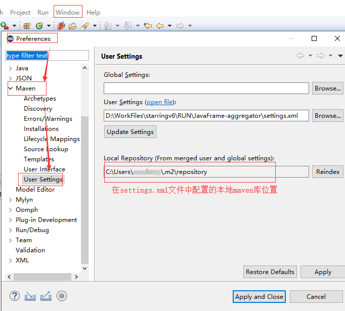 4.2 回到eclipse中点击Window--》Preferences,找到Maven--》User ,可以看到在4.2上配置的本地文件库位置,然后点击Apply应用。