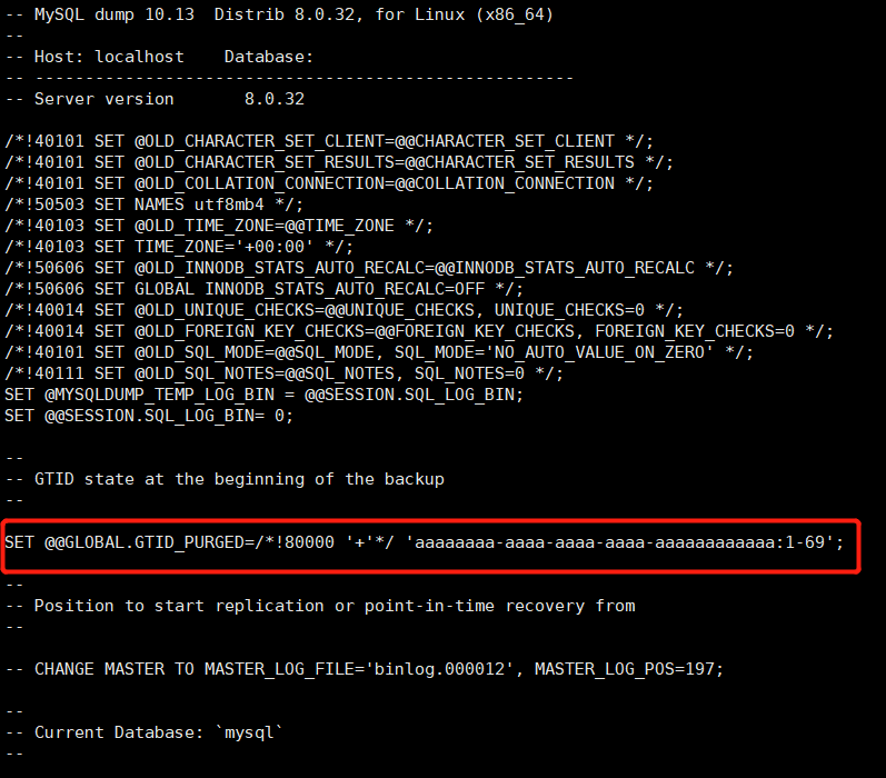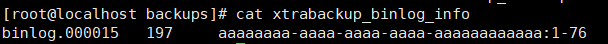 xtrabackup --prepare --target-dir=/root/backups/ xtrabackup --copy-back --target-dir=/root/backups/ chown -R mysql.mysql /var/lib/mysql #注意datadir路径及目录权限,且要为空目录 systemctl start mysqld.service #启动MySQL查看备份文件xtrabackup_binlog_info中的GTID值