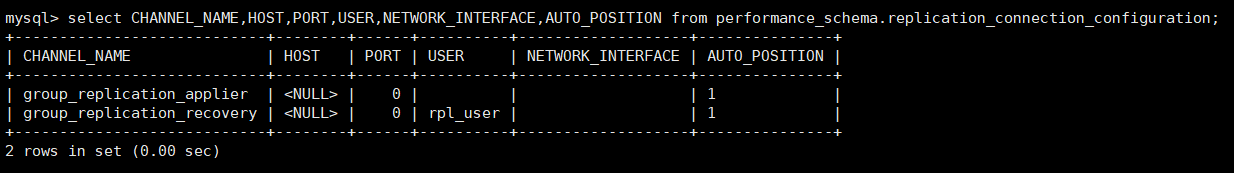 CHANGE REPLICATION SOURCE TO SOURCE_USER='rpl_user', SOURCE_PASSWORD='Zkk@123456' FOR CHANNEL 'group_replication_recovery';实际上,如果是全库备份恢复的,这里可以不在配置同步账号,因为账号已经保存在performance_schema.replication_connection_configuration表了,可以查看确认一下: