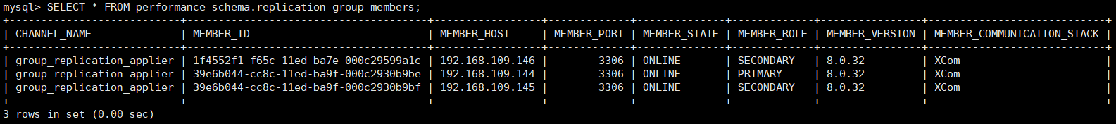 mysql>set global group_replication_group_seeds= "192.168.109.144:33061,192.168.109.145:33061,192.168.109.146:33061";注意同时修改/etc/my.cnf中group_replication_group_seeds的值与上面一致。