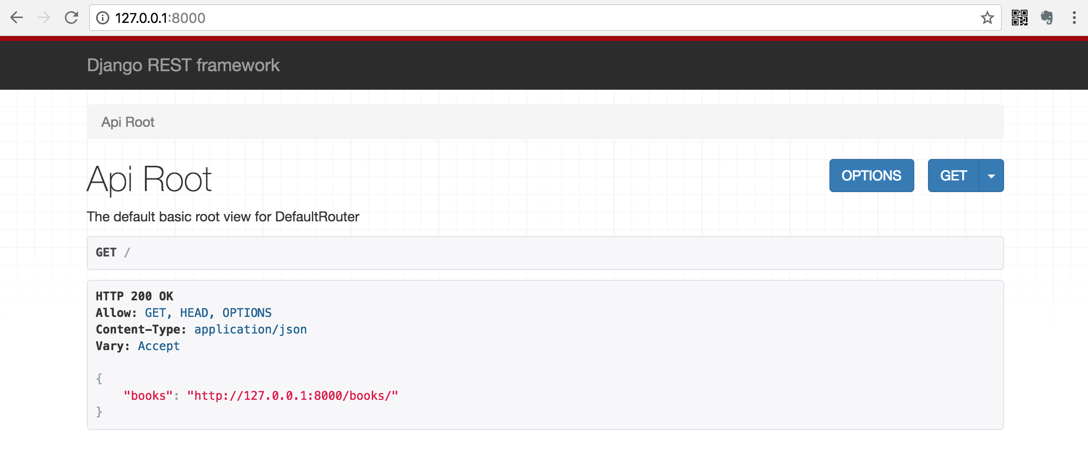 在浏览器中输入网址127.0.0.1:8000,可以看到DRF提供的API Web浏览页面: