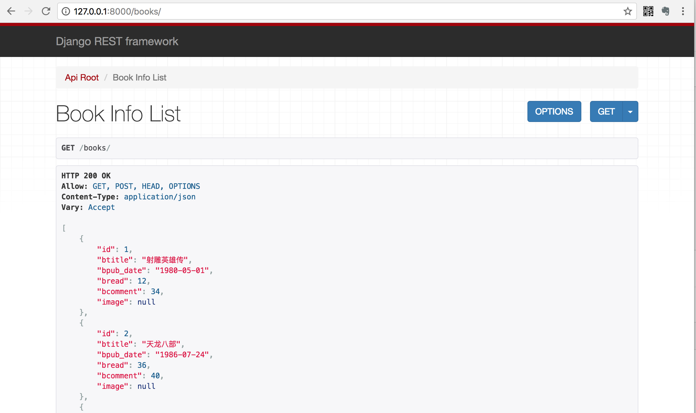 1)点击链接127.0.0.1:8000/books/ 可以访问获取所有数据的接口,呈现如下页面: