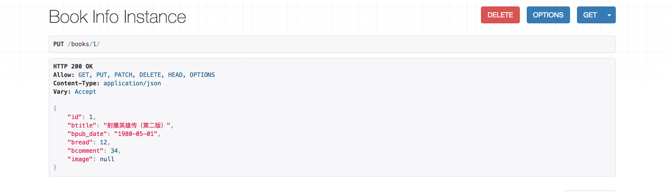 3)在浏览器中输入网址127.0.0.1:8000/books/1/,可以访问获取单一图书信息的接口(id为1的图书),呈现如下页面: