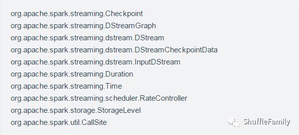 通过对Checkpoint类以及它的成员属性进行递归查找,确定Spark内部相关联的序列化类有: