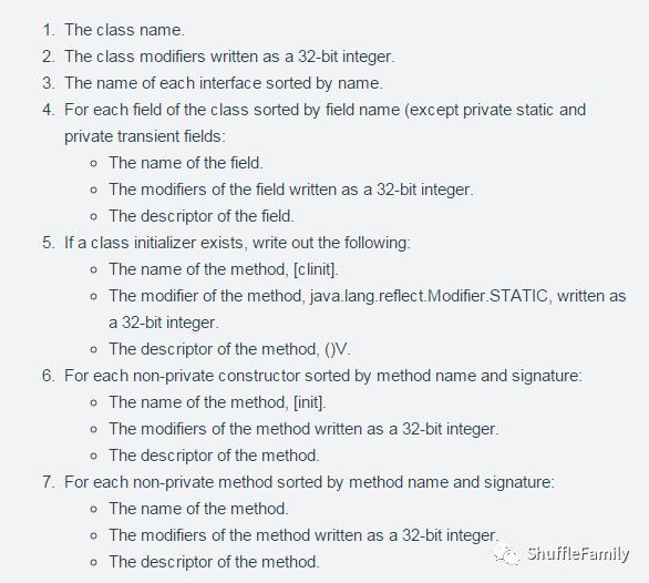 如果不显式设置,SerialVersionUID如何确定?在《Java Object Serialization Specification》http://docs.oracle.com/javase/7/docs/platform/serialization/spec/class.html#4100是这样描述的: