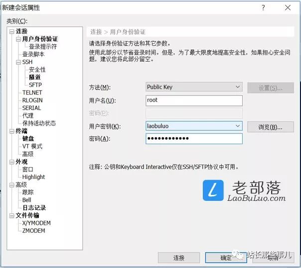 这里我们在登入服务器的时候,要选择Public Key,然后用户密钥选择我们创建的,以及填写密码。这样就可以通过密钥登入服务器,密码已经无效。