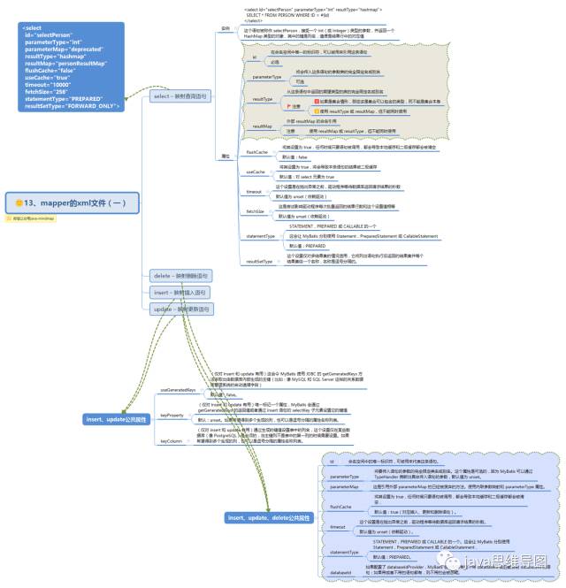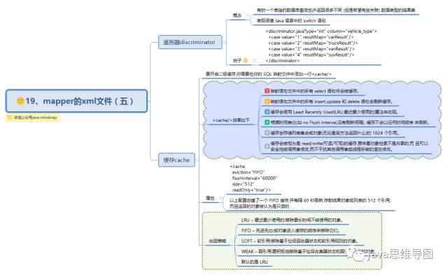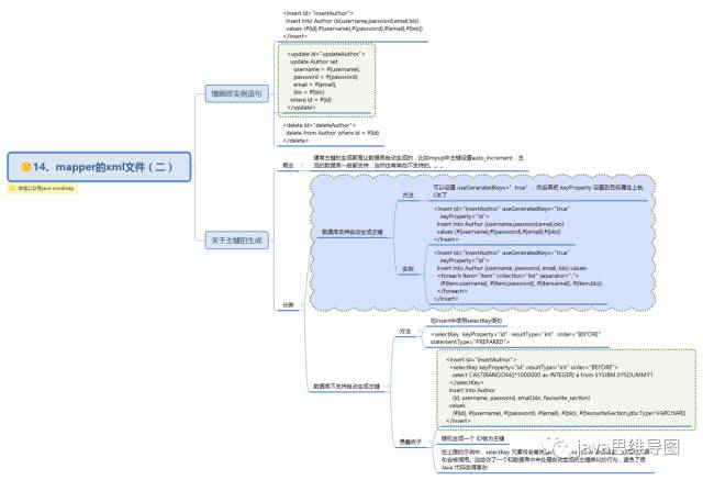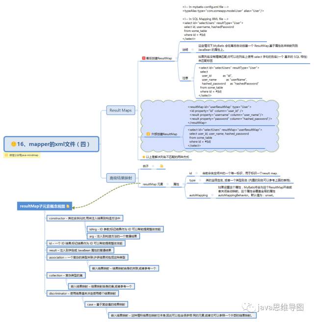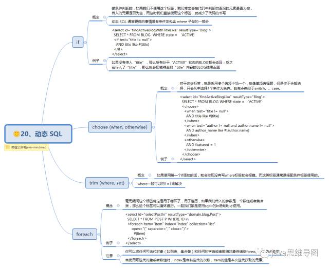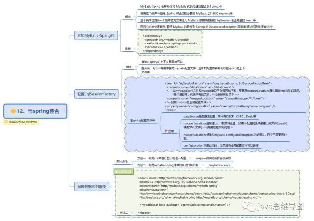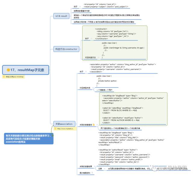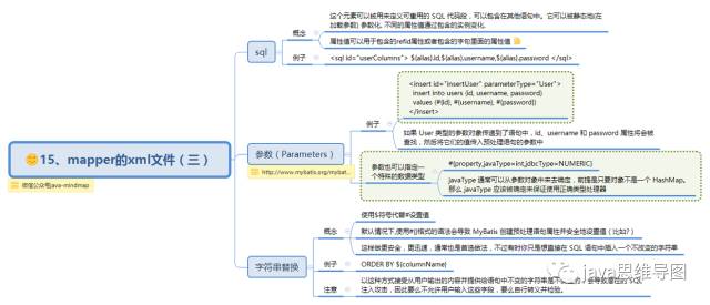 上一篇文章写了mybatis的基本原理和配置文件的基本使用,这一篇写mybatis的使用,主要包括与sping集成、动态sql、还有mapper的xml文件一下复杂配置等。值得注意的是,导图17和18中讲解resultMap子元素的时候可能讲得不是很清楚,应该需要大量的代码来讲解使用方法,思维导图恰恰不适合这种表现方法。所以需要读者根据给出的链接去读一些好的博客文章,这样才能更好理解。毕竟是技术性的东西,实践出真理。