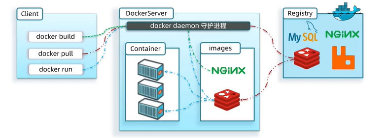 (1)、服务器(server):Docker守护进程,负责处理Docker指令,管理镜像、容器等。