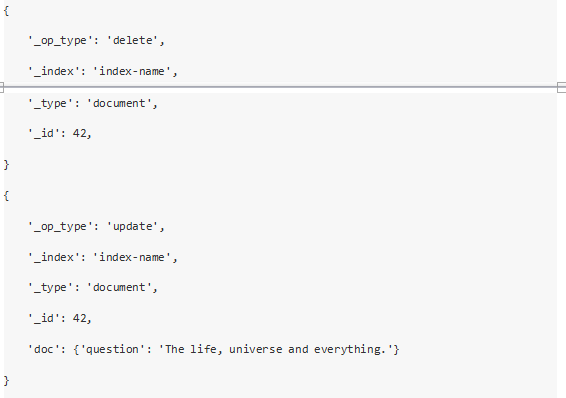 对于索引的批量删除和更新操作,对应的文档格式如下,更新文档中的doc节点是必须的。