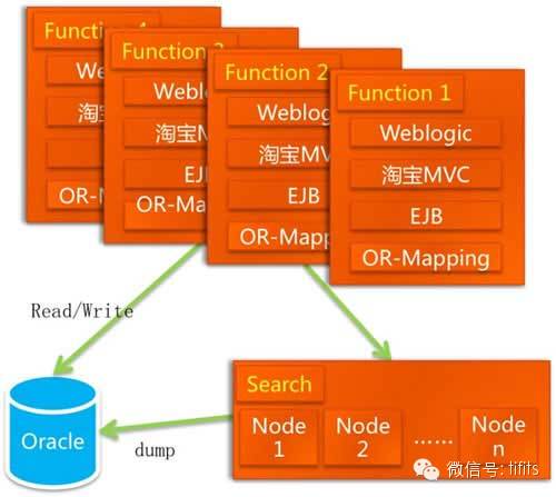 Java 应用服务器是 Weblogic,MVC 框架是 WebX、控制层用了 EJB、持久层是 iBATIS,另外为了缓解数据库的压力,商品查询和店铺查询放在搜索引擎上面。这个架构图是不是好看了一点了,亲?