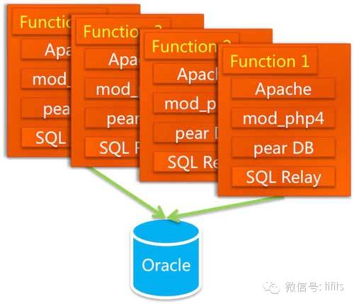 但更换数据库不是只换个库就可以的,访问方式,SQL 语法都要跟着变,最重要的一点是,Oracle 并发访问能力之所以如此强大,有一个关键性的设计——连接池。但对于 PHP 语言来说它是放在 Apache 上的,每一个请求都会对数据库产生一个连接,它没有连接池这种功能(Java 语言有 Servlet 容器,可以存放连接池)。那如何是好呢?这帮人打探到 eBay 在 PHP 下面用了一个连接池的工具,是 BEA 卖给他们的。我们知道 BEA 的东西都很贵,我们买不起,于是多隆在网上寻寻觅觅,找到一个开源的连接池代理服务 SQLRelay( http://sourceforge.jp/projects/freshmeat_sqlrelay ),这个东西能够提供连接池的功能,多隆对它进行了一些功能改进之后就拿来用了。这样系统的架构就变成了如下的样子: