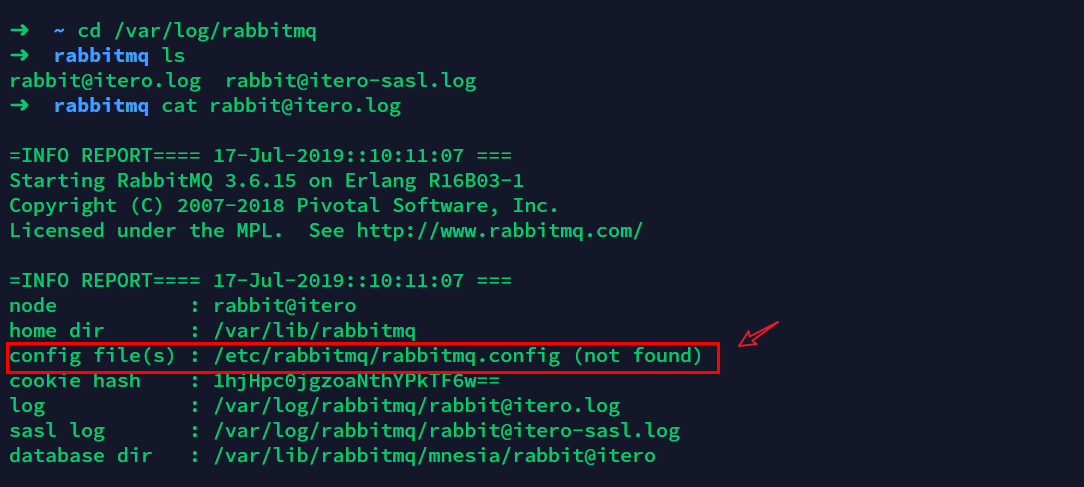 RabbitMQ日志文件位于/var/log/rabbitmq目录下,RabbitMQ启动时,会在/etc/rabbitmq下寻找rabbitmq.config文件,我们可以自己创建这个文件。