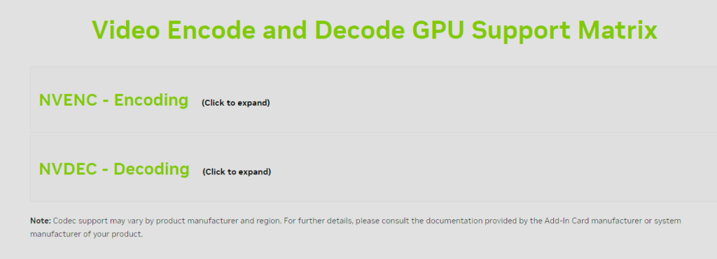 Nvidia官方有一个完整的显卡芯片的解码和编码矩阵图,可以清晰的查询各类型号新卡的支持能力。选择一个对的显卡,那么你的视频硬解码也就成功了一半。