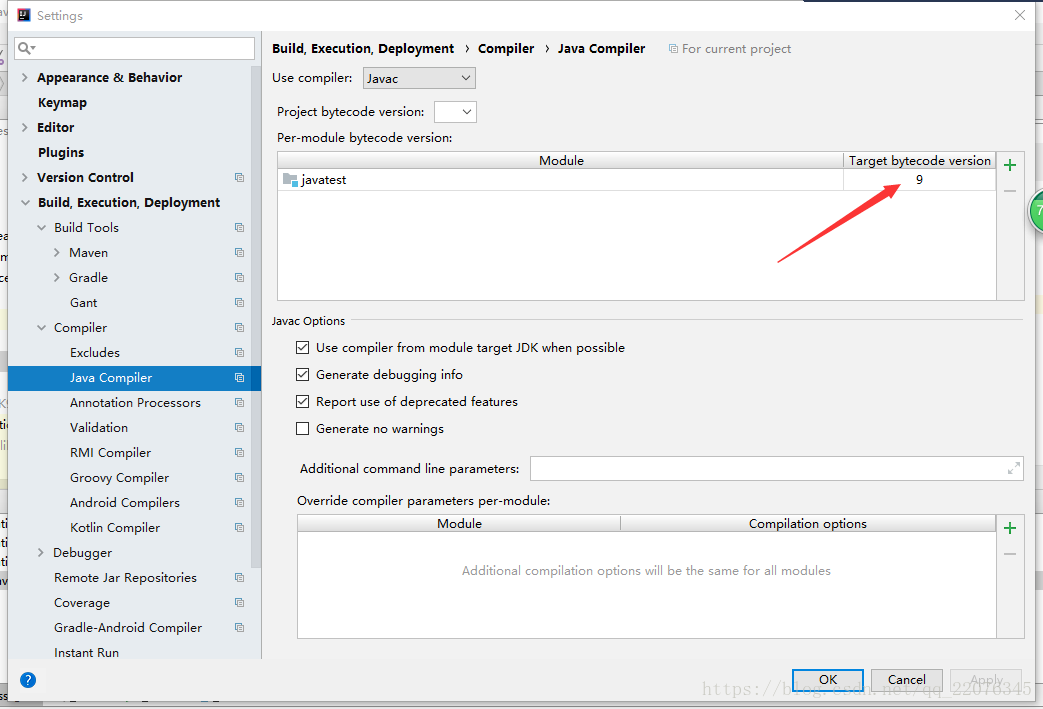 《2》点击“Settings”-->“Bulid, Execution,Deployment”-->“Java Compiler”,Target bytecode version设为本地Java版本。