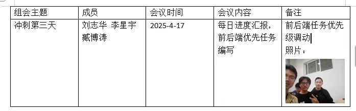 附上会议现场照片(成员围坐讨论任务看板、梳理优先级场景 ),记录冲刺阶段“聚焦关键、动态协同”的作战时刻。后续将紧盯优先级任务推进,用更紧凑的节奏让项目功能从“单点突破”走向“流程闭环”,第三天的校准,只为第四天的加速冲刺!