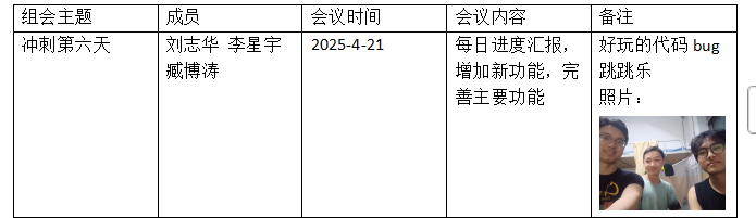 | 冲刺第六天 | 刘志华、李星宇、臧博涛 | 2025-4-21 | 进度同步、新功能开发、核心功能完善 | 代码 bug 成“跳跳乐”,设备管理系统的“除虫大作战” |