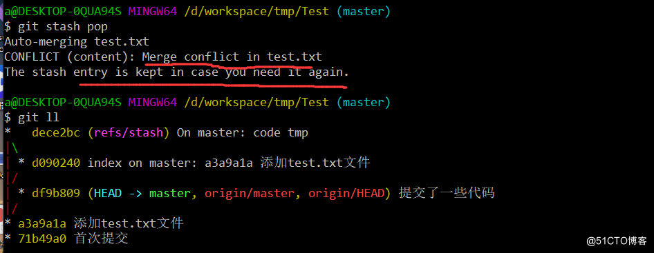 c.将临时存储区中的代码弹出到工作区,这样会自动合并工作区中的文件,有可能有冲突,有可能没有冲突。