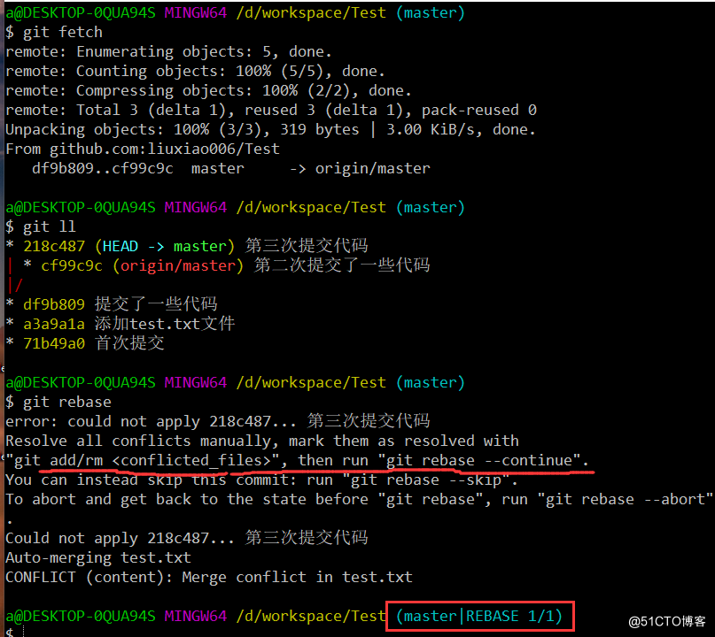 c.这里可以看到同步代码,出现了冲突,并且上面也提示了冲突解决后应该继续执行git rebase --continue