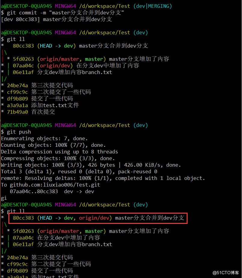 5.此时将分支切回master分支,将dev分支合并到master分支。