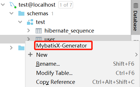 在IDEA的Database(前提是已连接相应的数据库)中,选中user表并右键,选择MybatisX-Generator