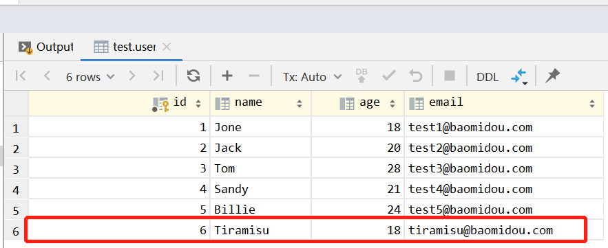 (1, 'Jone', 18, 'test1@baomidou.com'),