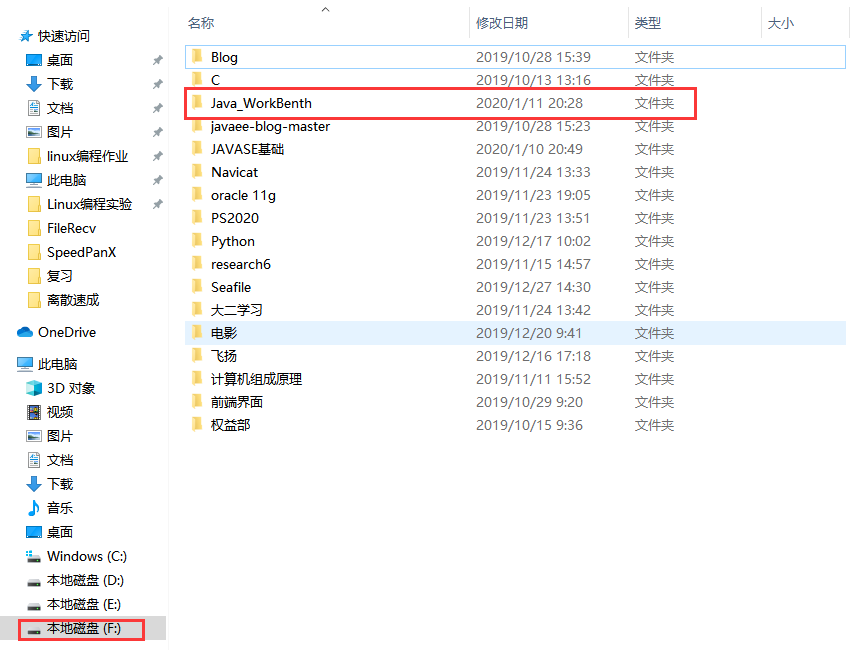 麻烦找一个指定盘符的确切文件位置(尽量不要把要运行的.java文件建在桌面上,因为在Dos命令行中找文件路径比较麻烦!),可以创建一个专门用来练习入门Java程序的文件夹。(比如我这个暂时存放.java文件的文件夹在F盘的Java_WorkBenth文件夹里面)