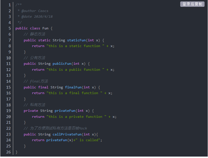 现在有一个类,我们需要对其中的公有方法、持有方法、静态方法、final方法进行Mock.