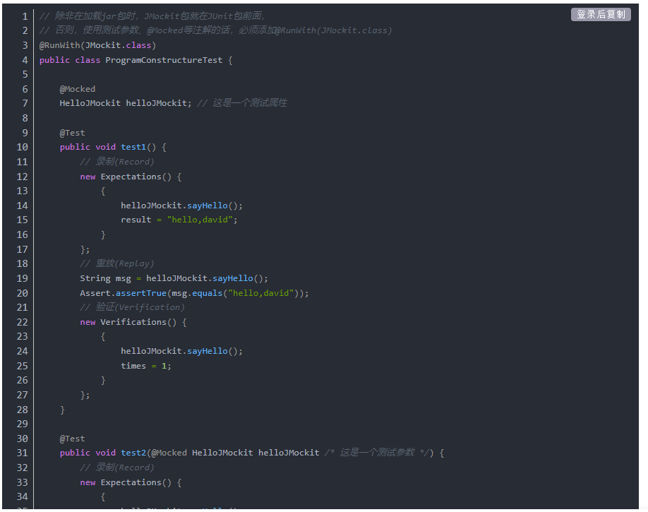 在JMockit单元测试中最常见的写法:录制代码块,重放测试逻辑,验证代码块。Record-Replay-Verification 是JMockit测试程序的主要结构。