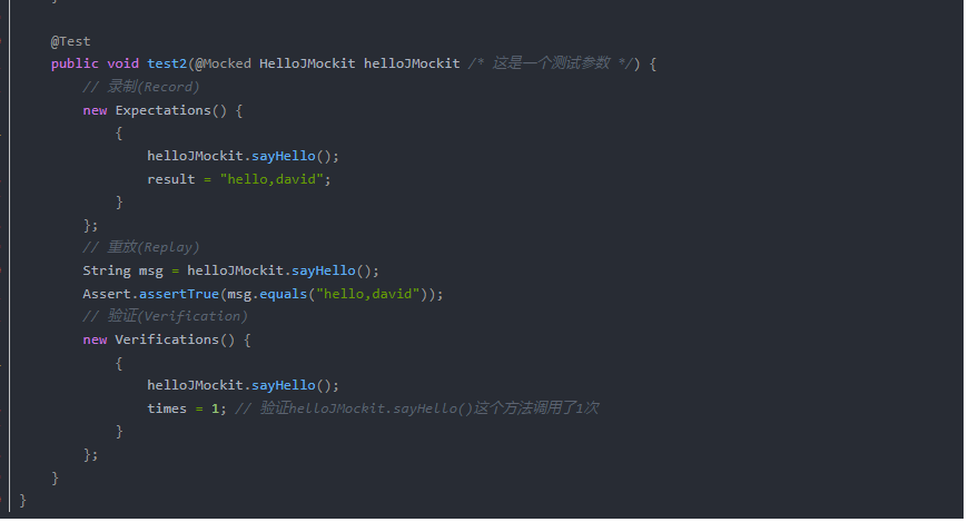 (2)在上述例子中,我们用@Mocked修饰了测试属性HelloJMockit helloJMockit,表示helloJMockit这个测试属性,它的实例化,属性赋值,方法调用的返回值全部由JMockit来接管,接管后,helloJMockit的行为与HelloJMockit类定义的不一样了,而是由录制脚本来定义了。